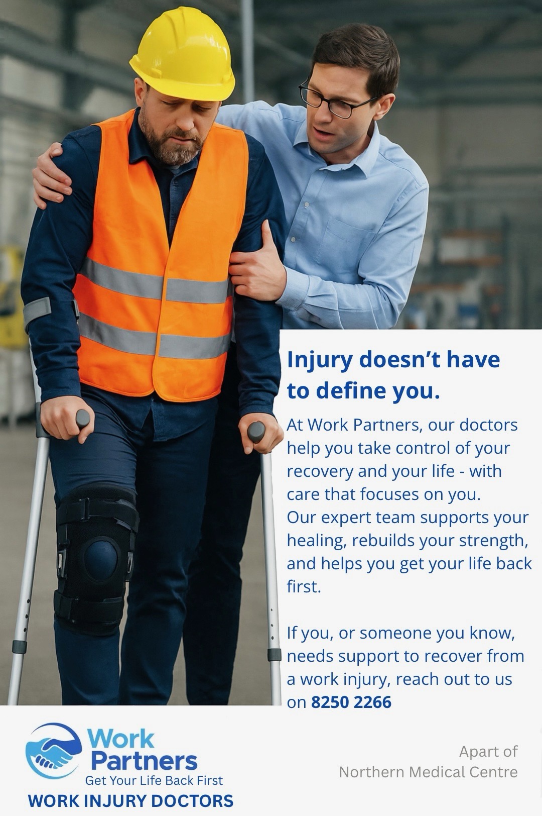 Injury doesn’t have to define you. At Work Partners, we help you take control of your recovery and your life — with care that focuses on you. Our expert team supports your healing, rebuilds your strength, and helps you get your life back first.