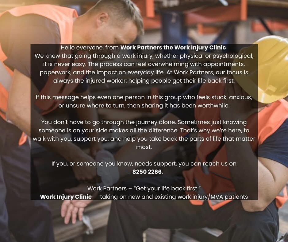 Over years of working with injured workers, we have seen how a single injury can affect far more than just the body. It can disrupt every part of a person’s life — their mental health, finances, family relationships, and social connections. Many of our patients have shared the same heartfelt wish when asked about their goal: “I just want my life back.” Those words stay with us. They reflect not only the physical pain but also the emotional and psychological toll of workplace injuries. That truth inspired our motto: Get your life back first. Because at Work Partners, we believe recovery starts with you — your wellbeing, your confidence, your life.
